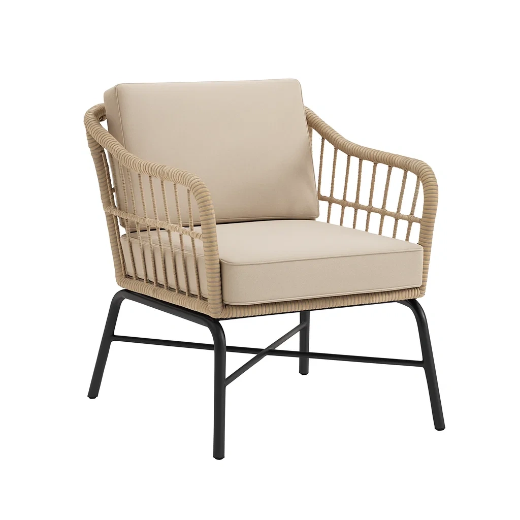 Fauteuil en rotin synthétique avec coussins beiges et structure en métal noir